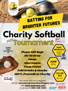 We are excited to invite you to partner with us for the Batting for Brighter Futures Charity Softball Tournament on Saturday, June 6th at Talbot Park in Port McNicoll. This community-driven event will bring together athletes, local businesses, supporters, and volunteers for a fun and meaningful day of softball, with 100% of the proceeds supporting We Are The Villagers.